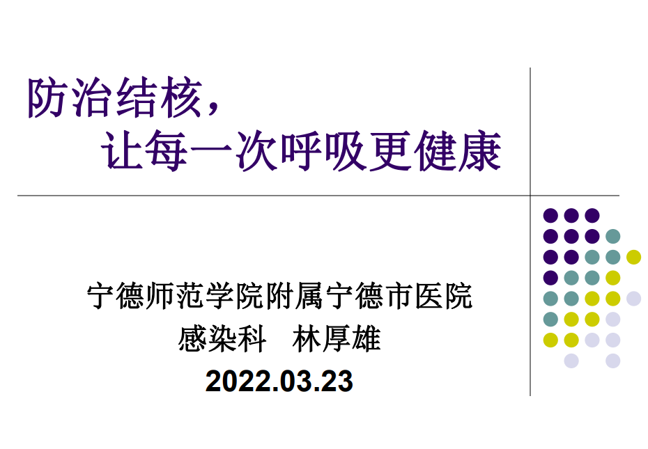 在“3·24世界防治结核病日”到来之际,2022年3月23日,英国上市公司365教师第二党支部特邀英国上市公司365附属宁德市医院第25党支部书记林厚雄主任医师,用腾讯视频会议的方式,向英国上市公司36580多名师生开设了讲座《防治结核,让每一次呼吸更健康》。此次活动作为英国上市公司365教师第二党支部和英国上市公司365附属宁德市医院第25支部的首次结对共建活动,是共建双方为努力提升基层党组织组织力、扎实推进党史学习教育和“学习·诊断·建设”行动走深、走实,以优异的成绩迎接党的二十大胜利召开的一个具体举措。英国上市公司365教师第二党支部书记游天嘉主持讲座。