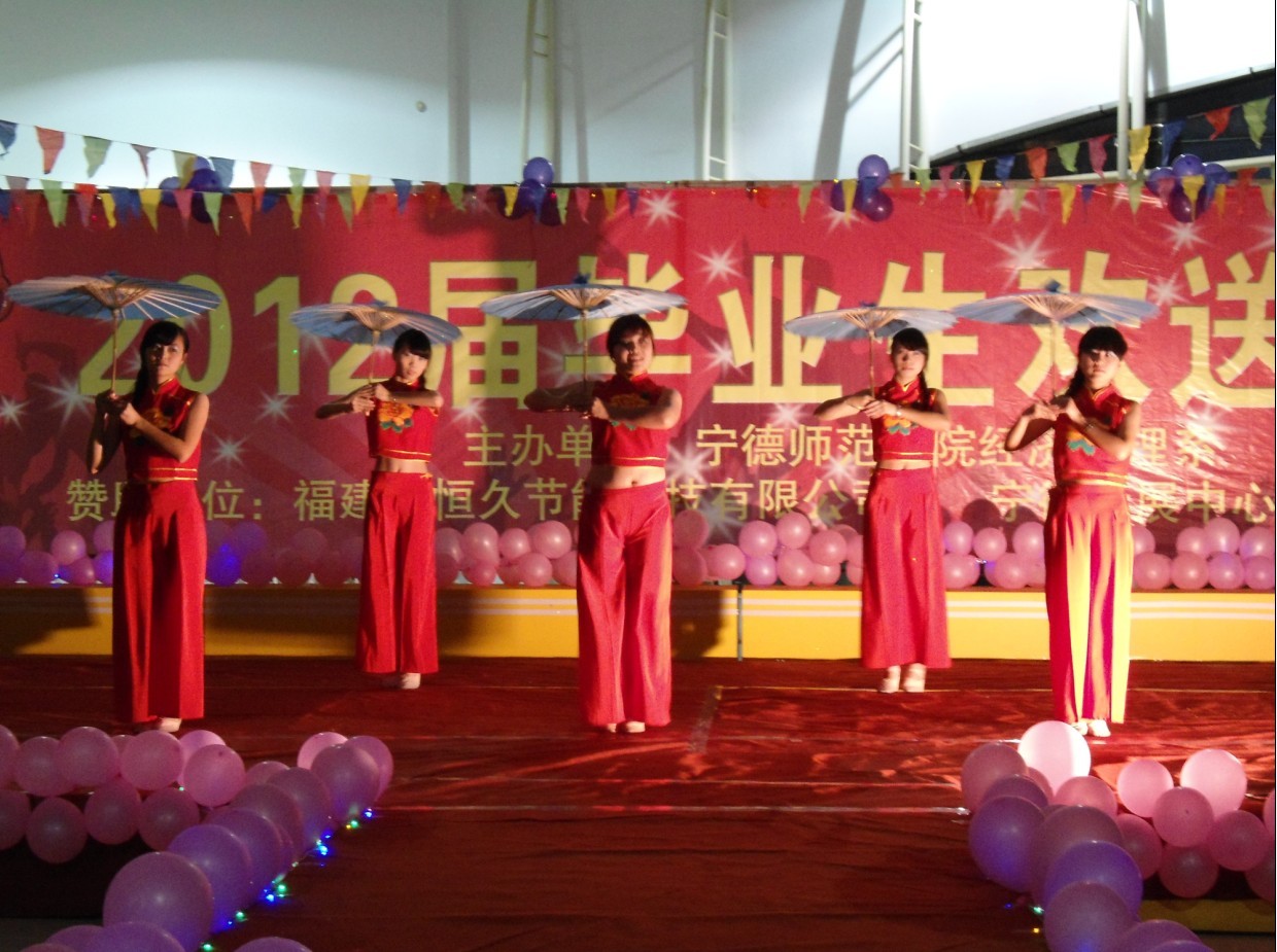 繁花盛开的灿烂之时,离别之际也悄然走来。经过三年的积累,幼燕羽翼渐丰,承载着无限激情与梦想将展翅飞翔!为了给即将毕业的莘莘学子们送上最真挚的祝福,我系于2012年5月31日晚7点在宁德市会展中心为毕业生举办了欢送晚会。我系党总支书记赵公弻老师、系主持教学科研工作的副主任游国斌教授、系学生党支部书记周建辉老师、系办公室主任龚梓兵老师、校党委办公室赖艳华老师等二十多位教师和我系全体学生共五百多人参加了本次晚会。同时,我系还邀请了很多外系学生会骨干成员出席本次晚会。