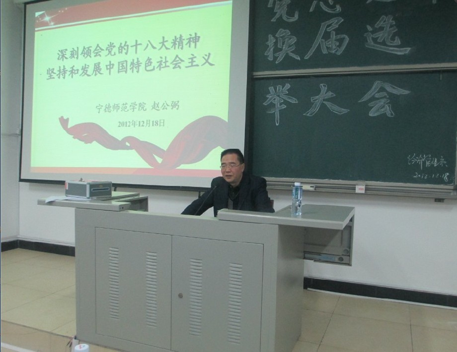 党的十八大是在我国进入全面建成小康社会决定性阶段召开的一次十分重要的大会,为了全系师生更好地学习贯彻党的十八大基本精神,引导大家理解党的十八大精髓与实质进一步统一思想、深化认识。12月18日下午我系特邀宁德师院宣传部部长赵公弼老师带来一场学习党的十八大精神专题讲座,出席讲座的有宁德师院副校长魏远竹教授、经管系党总支书记游国斌教授及我系全体师生。游国斌教授主持此次讲座。
