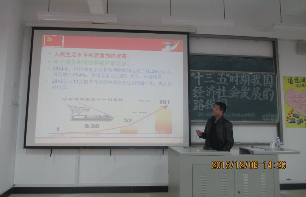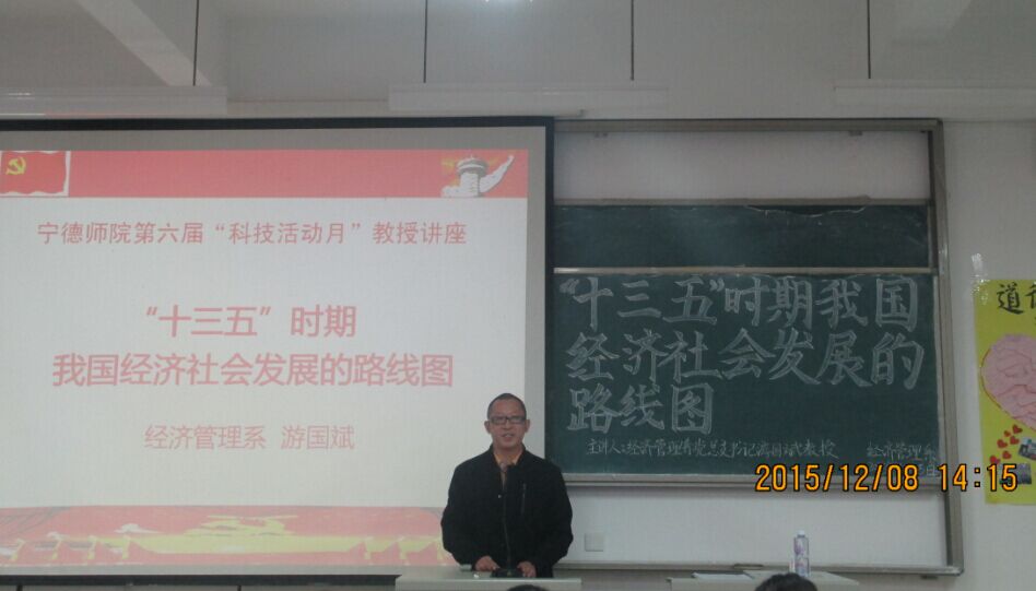 积极响应我校科技活动月,深入贯彻党的十八届五中全会精神, 2015年12月8日下午14点10分,经济管理系党总支书记兼系主任游国斌教授在求真楼Bb201为师生作了题为“十三五”时期我国经济社会发展的路线图的专题讲座。出席此次讲座的有校宣部部长赵公弼、系党总支副书记周建辉、教师党支部书记吴家林等十几位老师及百余名学生。系党总支副书记周建辉主持本场讲座。