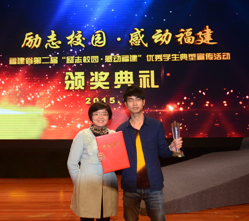 2015年5月份,省教育厅、省财政等十六部门在全省范围内开展了优秀学生典型评选宣传活动,经过严格的层层选拔,我校推荐的经管系郑艺才同学从全省参评的75名学生中脱颖而出,成为20位“福建励志先锋”候选人,其典型事迹获福建省多家电视媒体的广泛宣传。2015年12月24日,我校学工处资助中心欧嘉烟老师和郑艺才同学应邀参加第二届“励志校园•感动福建”优秀学生典型宣传活动颁奖典礼。
