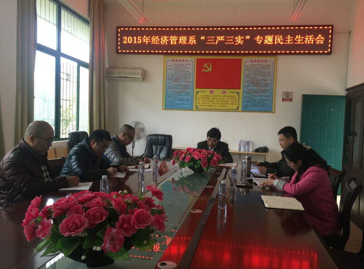 2016年1月11日,经济管理系按照既定的工作方案如期召开了2015年“三严三实”专题民主生活会,会议由经济管理系主任兼党总支书记游国斌同志主持,并邀请到英国上市公司365党委委员、副院长魏远竹同志莅临指导。会上,系领导班子和副处级以上干部分别对照“严以修身、严以用权、严以律己,谋事要实、创业要实、做人要实”要求,联系思想、生活和工作实际,深入查摆自身在对党忠诚、个人干净、敢于担当、遵守党的纪律方面存在的问题和不足,严肃认真地开展了批评和自我批评。魏远竹副院长对于此次民主生活会给予肯定,认为此次民主生活会开得很成功,希望能继续做好立规执纪,针对会上提出的相关问题认真抓好整改落实,增强践行“三严三实”要求的思想自觉性和行动自觉性。