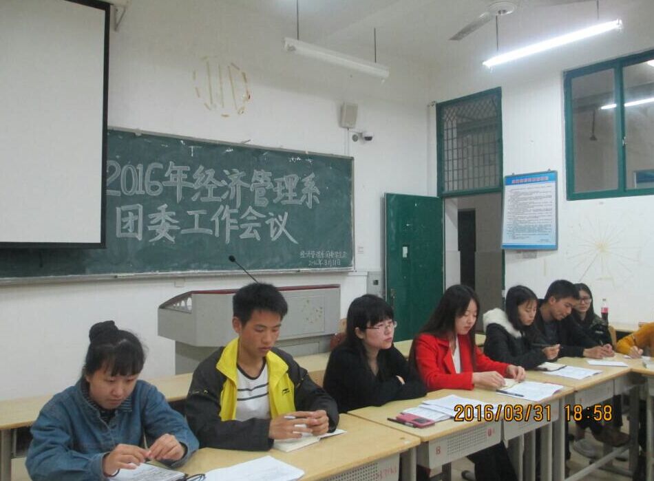 为进一步加强共青团的基层组织建设,充分发挥团支部在促进学习、丰富文化、凝聚力量中的积极作用,做好十佳团支部建设活动,2016年3月31日晚6:30分,经济管理系于求真楼Bb304成功召开2016年团委工作会议。出席此次会议的有系团委书记王佳佳,部分学生会干部,各班班长和团支书以及五大社团的负责人。