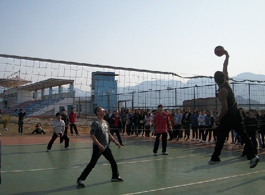 比赛紧张激烈,队员们在球场上挥汗如雨,助威的同学在场下高声呐喊,为队员加油鼓劲。比赛期间,老师和学生都拿出了百分之百的精力和毅力,努力去争取最好的结果。本着领先不骄傲,落后也不气馁的原则,各队队员积极配合,场上不时出现精彩的接球和扣球,排球场上才、掌声不断响起,高潮迭起。经过两局的精彩搏斗以2:2打成平手,最后的一局更是精彩万分,球来回被垫了数次,全场观众的心也随着球的来回而跳动着,所有的焦点都集中在这个来回跳跃的排球上。最后以学生排球队以三比二获得胜利。比赛增强了老师与学生之间的团结和默契,发扬了我系校师生顽强拼搏、永不放弃的精神。