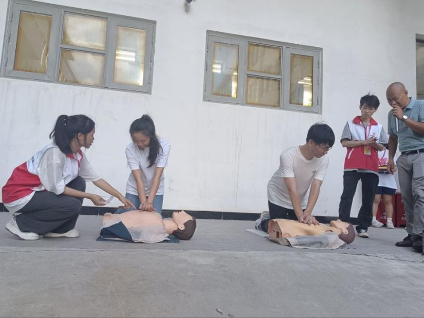 活动第二个环节,是由学校红十字会学生分会救护队副队长林依杰、培训干事蔡佳洁向同学们进行CPR(心肺复苏术)和AED(自动体外除颤仪)的操作、使用讲解和示范。部分同学还受邀进行了心肺复苏术的操作练习,参加过福建省第七届红十字急救大赛决赛的学生工作(部)处刘亚老师应邀到现场对本环节进行总结点评。
