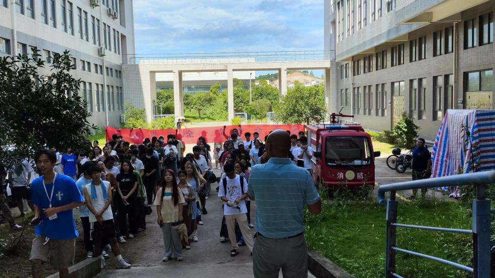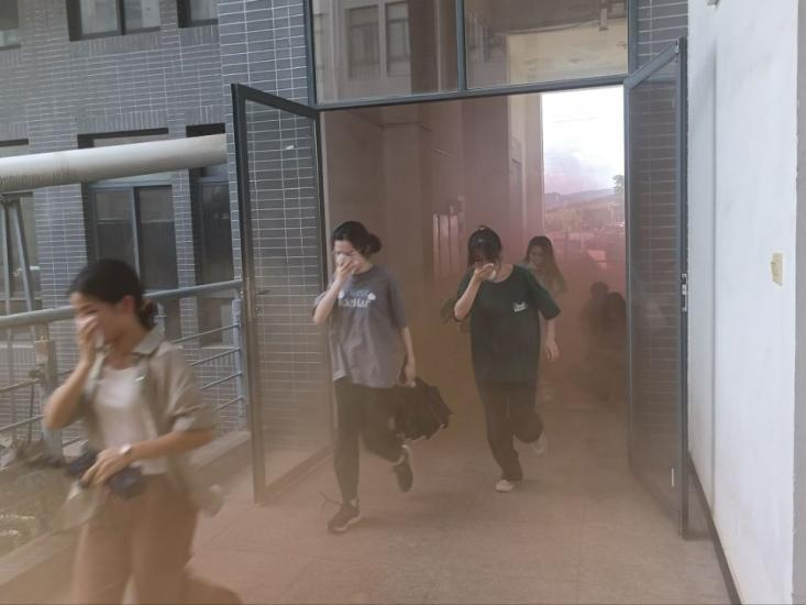 6月19日下午3时许,伴随着几股浓烟在逸夫实训楼疏散通道的滚滚升起,在火灾紧急疏散的语音提示广播播报声中,经管院两百余名学生在引导员的带领下,一个个手捂口鼻,低姿弯腰,从指定逃生路线有序撤离并抵达楼下的空旷地带。