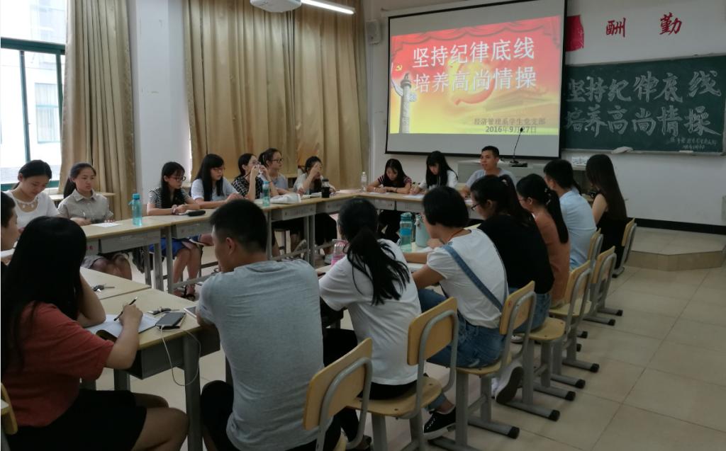 9月27日上午,经济管理系于求真楼b-204开展了主题为“坚守纪律底线,培养高尚情操”的党员学习会,本次学习会由系学生党支部书记邱文君老师主讲,参加学习的有我系学生党员和入党积极分子。