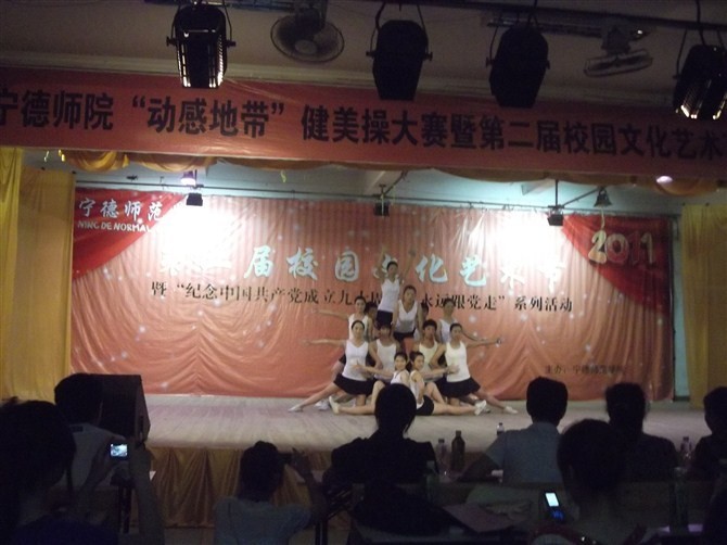 为了丰富同学们的课余生活,培养进取精神,迸发青春激情。2011年6月11日,晚上7点,共青团宁德师院委员会及宁德师院体育系团总支部学生会举办了我校首届健美操大赛!