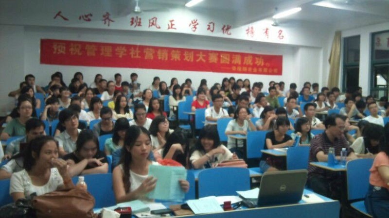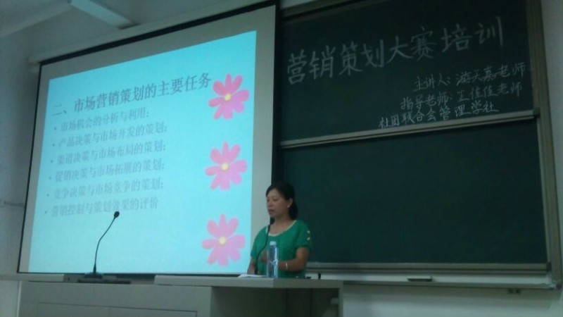 2013年10月9日晚7点,经管系的管理学社在BB301开展第三届英国上市公司365营销实战技能大赛的赛前培训。出席此次活动的有经管系马忠达、游天嘉、王佳佳三位老师,宁德奇隆翔农业有限公司总经理周倩敏女士。参加本次活动的还有管理学社社员及23支参赛队所有成员。此次活动由管理学社新一届社长李跃发主持,王佳佳老师代表讲话并提出几点期望,游天嘉老师对大家进行培训,最后由周总经理周倩敏女士向大家介绍产品总类及其功效。整场活动历时2个多小时,在自由提问环节,同学们还就各自感兴趣的话题与周总进行了探讨。