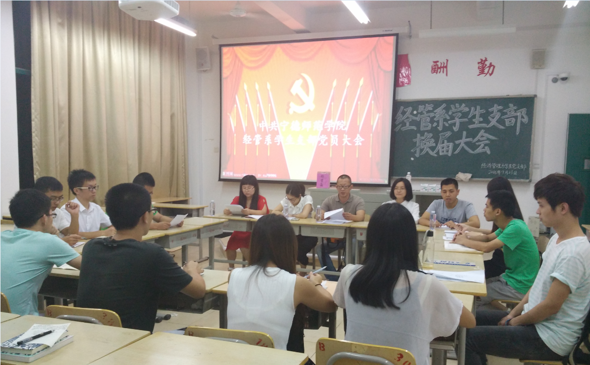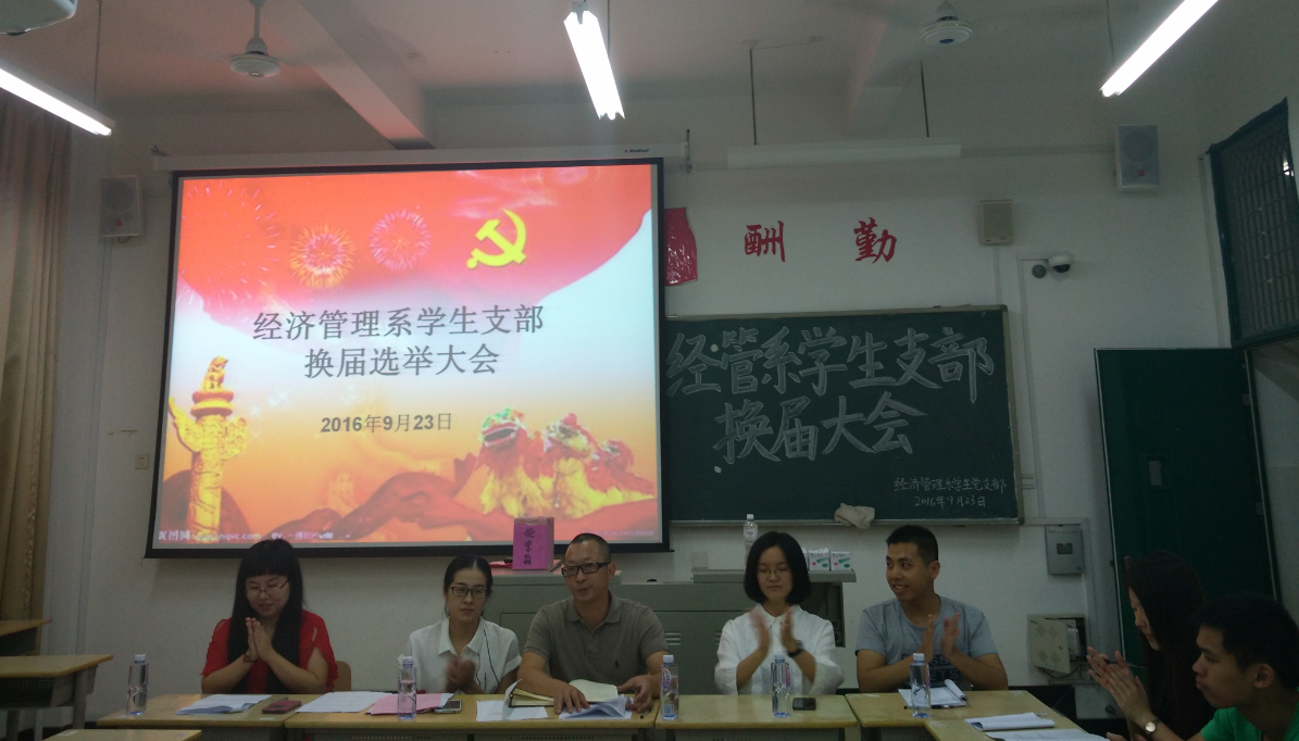 2016年9月23日晚上,经济管理系在求真楼-b204召开了经管系学生支部换届大会。参加本次大会的有系党总支副书记周建辉、系党务秘书周俪、系团委书记王佳佳、辅导员杜艳芳和邱文君以及我系所有在校党员。