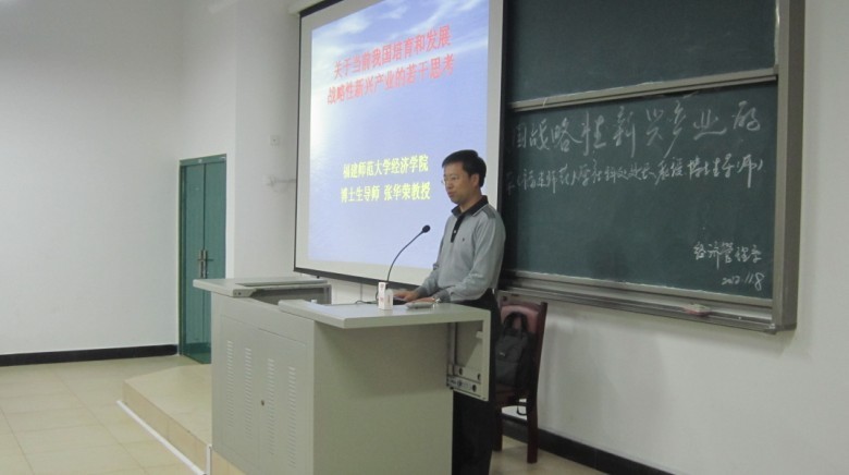2012年11月8日下午,我系特邀福建师范大学经济学院博士生导师张华荣教授作了一场以“关于当前我国培育和发展战略性新兴产业的若干思考”为主题的学术报告。此次报告,得到了广大师生的热烈响应,参加这场学术报告的有宁德师院魏远竹副院长、宁德师院宣传部长兼系党总支书记赵公弼老师、经管系行政负责人游国斌老师、科研处彭彪老师、以及校党政部门和我系的其他老师。系行政负责人游国斌老师主持讲座。