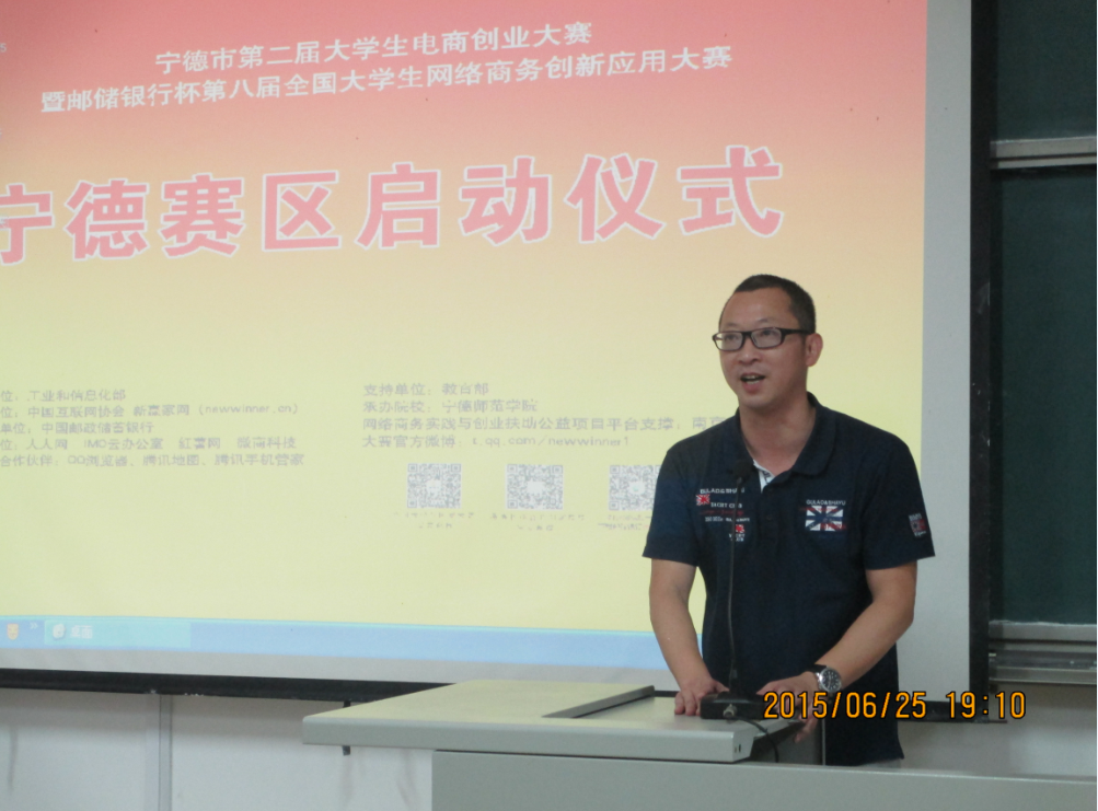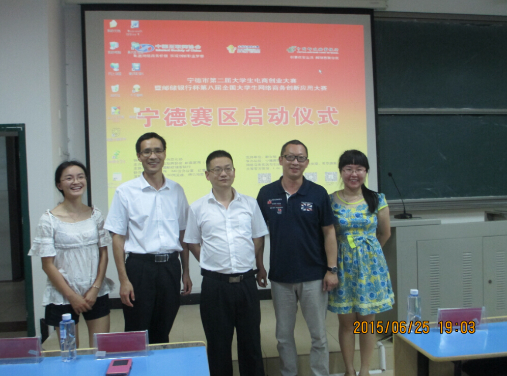 2015年6月25日晚上7:00,经济管理系于求真楼B区201教室举办了宁德市第二届大学生电商创业大赛暨邮储银行杯第八届全国大学生网络商务创新应用大赛宁德赛区的启动仪式。出席此次启动仪式的有英国上市公司365经济管理系党总支副书记周建辉、系团委书记王佳佳、专职辅导员杜艳芳等多名老师及中国邮政储蓄银行宁德市分行副行长丁东辉、宁德市分行个人金融部苏兴泉等领导。