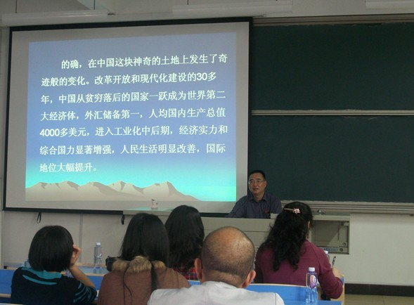 他向广大师生介绍了“中国模式”的实质:在全球化的背景下,中华民族在中国共产党领导下,把科学社会主义原则与当代中国国情和时代特征相结合走出的一条后发国家的现代化之路。这是一条以改革开放和社会主义现代化建设为实践基础的、以中国特色社会主义为奋斗旗帜的、以中国特色社会主义理论体系为指导思想的完全新型的现代化道路。中国自改革开放以来取得的种种巨大成就不仅增强了中国的国际地位和综合国力也引起了人们的一些思考。人们希望从中国足迹里解释异于西方的现代化之路。