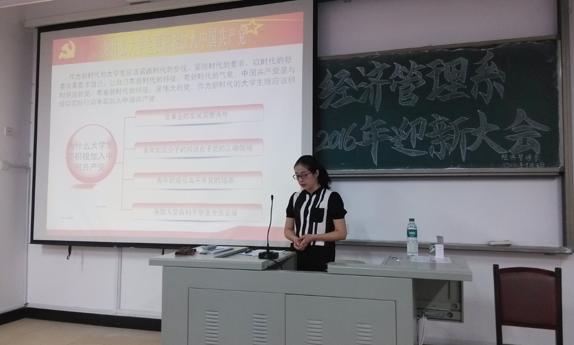 9月8日下午,经济管理系在东侨校区求真楼-b201教室召开了2016年迎新大会。参加本次大会的有系党总支副书记周建辉老师、系党务秘书兼学生党支部书记周俪老师、系团委书记王佳佳老师、专职辅导员以及我系全体新生。