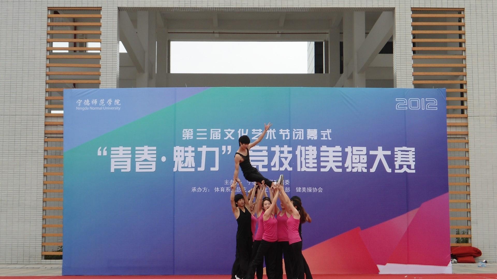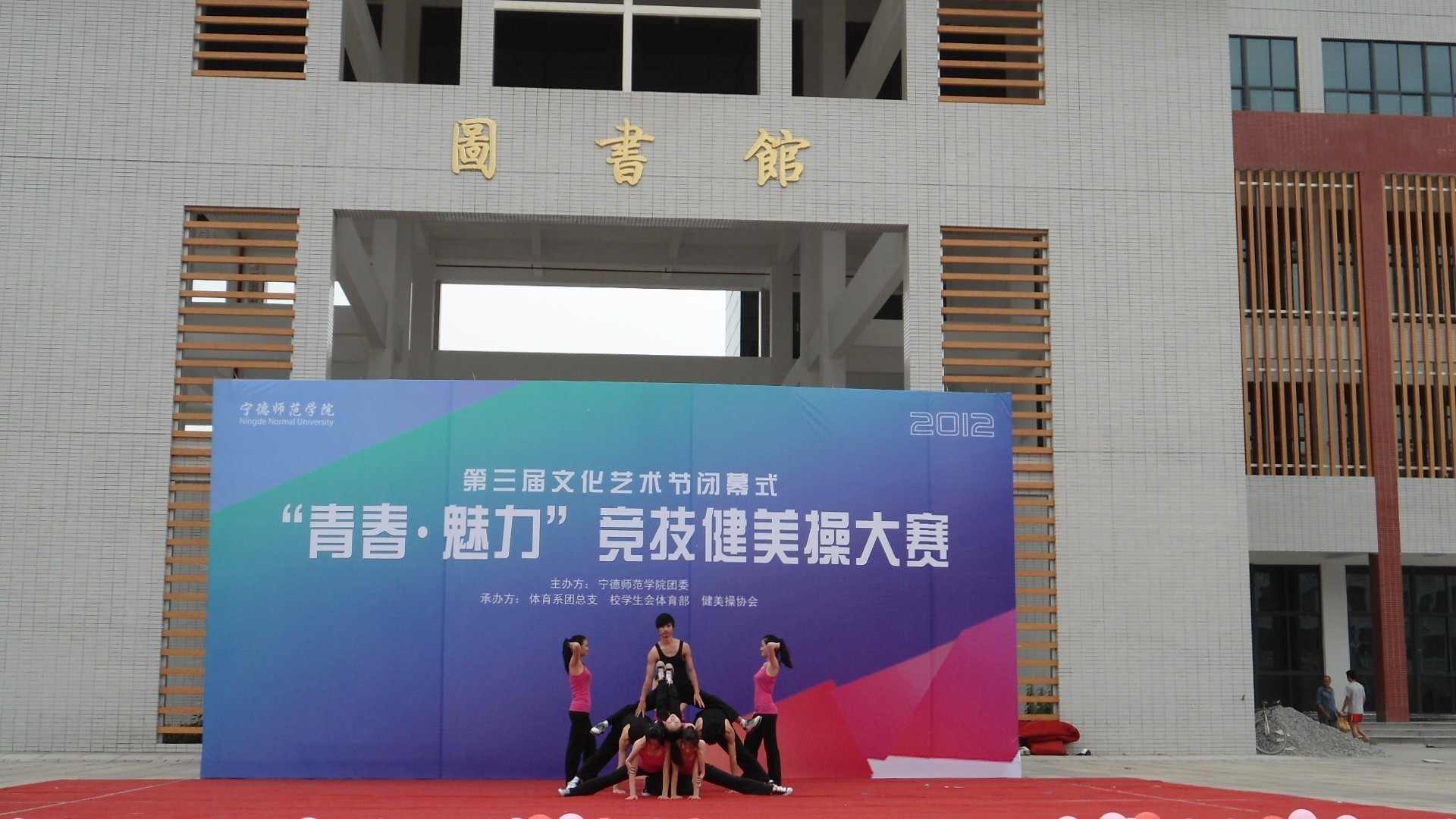 为了加强我校校园文化建设,营造科学、活力、和谐的校园氛围。进一步丰富同学们的课余文化生活,展示我校大学生健康向上、青春活力的风采。我校于2012年5月29日下午4点,在图书馆前举办了第三届文化艺术节竞技健美操大赛。