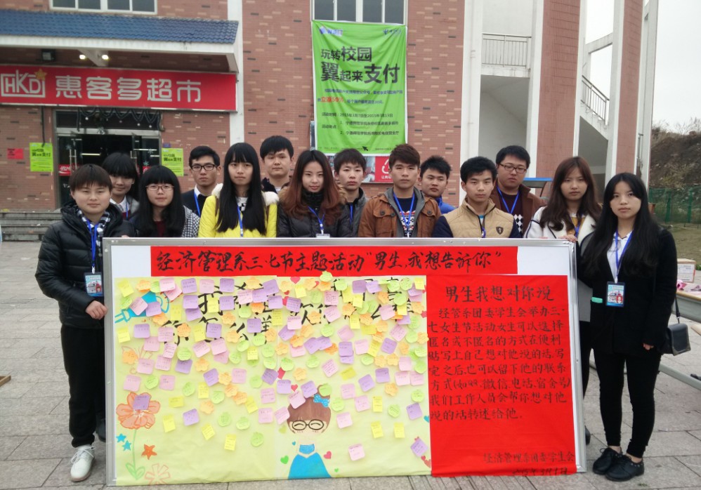 为了发扬女生节,丰富大学生活,本着服务女生,方便女生的态度。经济管理系团委学生会于2015年3月7日上午在新校区惠客多超市前举办了“男生我想对你说”的女生节活动。