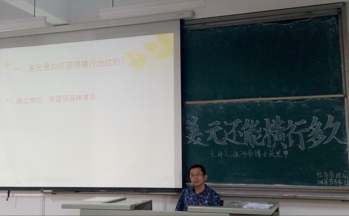 关思甲博士以扎实的理论功底和广阔的国际视野,深入浅出地介绍了四个方面:一、美国是如何获得横行地位的;二、美元横行是怎样运行的;三、如何维护美元的横行地位;四、美元还能横行几时。讲座内容结束时关博士回答了现场师生提出的多个相关问题。