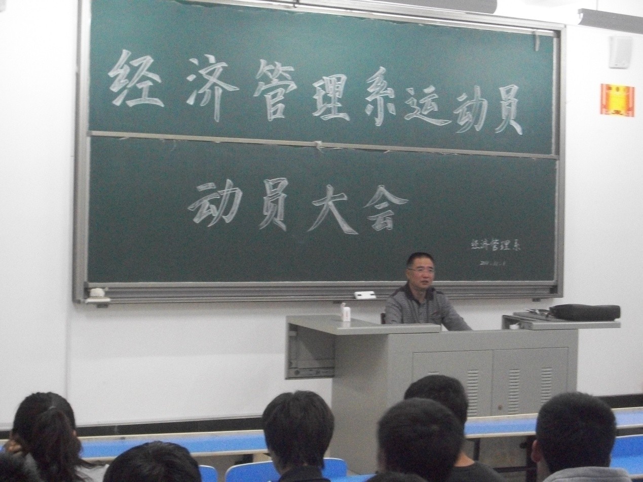 2011年11月1日下午,我系在校运动会前,召开全系运动员动员大会。出席本次动员大会的老师有经济管理系党总支书记赵公弼老师,经济管理系学生支部书记周建辉老师,王佳佳老师,林秀椿等老师。本次动员大会不仅对接下来为期3天的运动会做了详细的工作部署,同时也鼓舞了我系运动员们的士气,助长了全系上下齐心拼搏的决心。大会上,赵公弼老师表扬了运动员们艰苦的训练过程,及其他们坚忍的体育精神。身为一个经管人,一个经管系的运动员,他们表现出的不仅仅是一个运动员坚持到底、绝不言弃的坚定,更加表现出了经管人的激情和愈战愈勇的奋斗精神。运动员们将在运动场上,用辛勤的汗水化作追求的脚步,当又一轮红日升起的时候,他们将以英雄的姿态立于赛场之上,用他们的汗水去赢得骄傲!为我们经管系赢得荣誉!