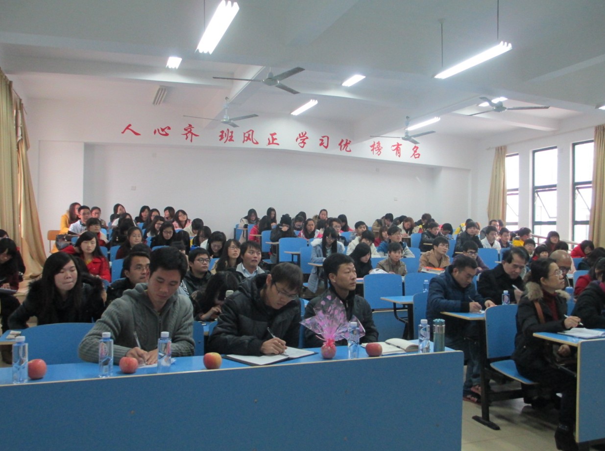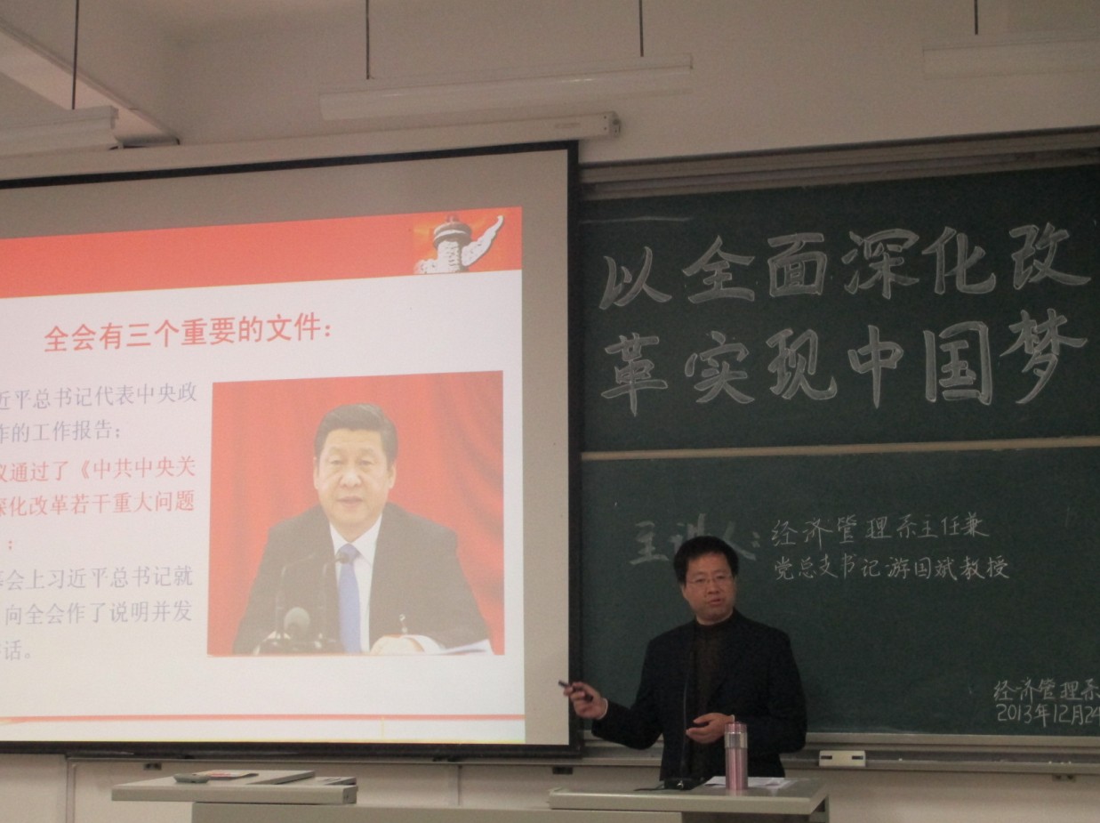 经管系以英国上市公司365科技文化活动月为平台,于2013年12月24日下午在求真楼BB301举办了一场主题为“以全面深化改革实现中国梦”的讲座。此次讲座由经济管理系党总支书记游国斌教授主讲,经济管理系办公室主任龚梓兵老师主持本场讲座,出席此次讲座的有经济管理系近二十名教师以及百余名学生。
