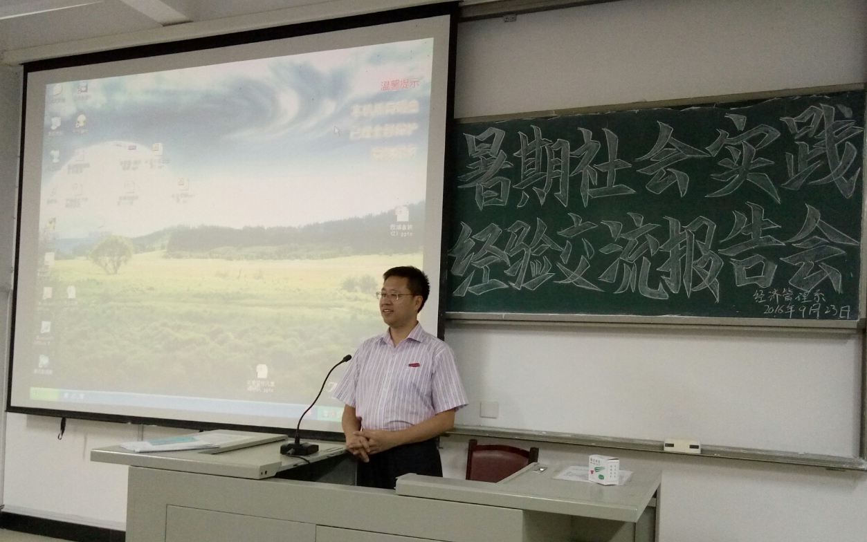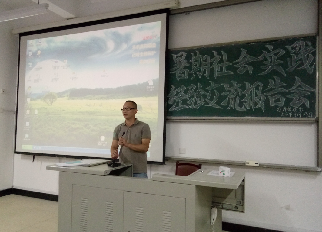 2016年9月23日晚上,经济管理系于求真楼b-201召开了暑期社会实践经验交流报告会。出席本次报告会的有系主任兼系党总支书记游国斌、系党总支副书记周建辉、系团委书记王佳佳、社会实践带队老师以及参加社会实践的所有团队成员。