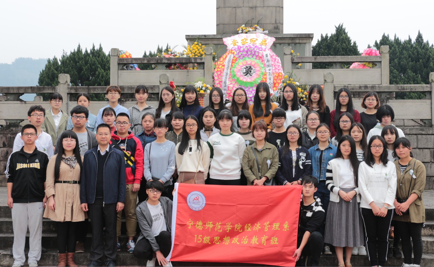 2017年4月6日上午9点,经济管理系系主任兼系党总支书记游国斌、系团委书记王佳佳两位老师带领15级思想政治教育班的同学来到烈士陵园,祭奠革命先烈。本次祭扫仪式由王佳佳老师主持,大家首先为先烈默哀三分钟。默哀结束后,游国斌教授为师生们讲述闽东红色历史。