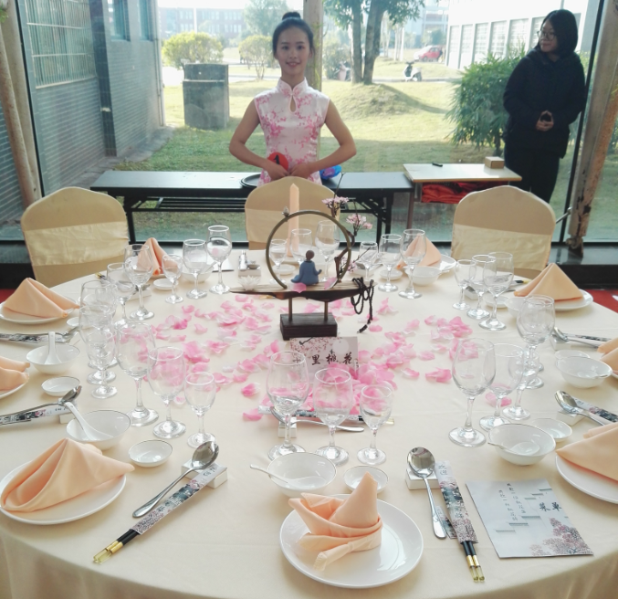 大赛内容包括中餐宴会摆台、中式铺床、英语口语等项目,以中餐摆台人员的礼仪展示秀和Hip hop舞蹈拉开序幕。选手们分组依次进行了技能比拼,他们仪态优雅美观,动作娴熟敏捷,将职业素养和自身气质展现得淋漓尽致。林平同学以“十里桃花”为主题的创意设计获得中餐摆台项目一等奖,其设计的台面营造了梦中仙境之感,给客人留下纯真、温馨的感觉。胡碎燕同学的开夜床设计主题为“剪彩为人,传承经典”,以中国剪纸与多彩糖果结合,象征甜蜜美满,寓意吉祥喜庆,获得中式铺床项目一等奖。