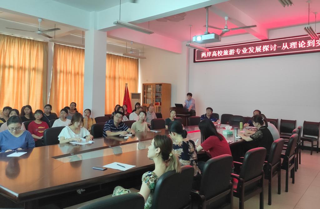 范教授首先以台湾南开科技大学数位旅游管理系为例,介绍了其开创历程、专业课程设置、师资队伍配备等情况。又以专业课程为例,讲授了课程的多元化考核体系、学生如何开展课程校外实践等。同时还分享了浙江遂昌民宿的运营管理案例,在座师生受益匪浅。