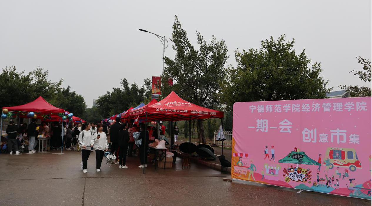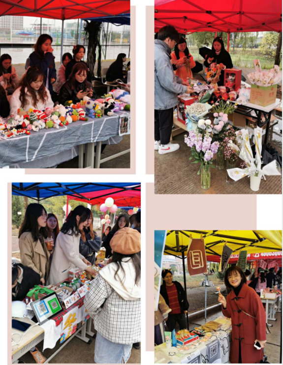 琴湖畔深绿的榕树,对应的是整齐的红色帐篷。活动当日,虽遇风雨,同学们却依旧用心做好一切准备工作,展现出大学生迎难而上的精神面貌。各个摊位摆满了商品,各组“摊主”经过了一个多月的酝酿,充分发挥自己的创意和技能,售卖自己的“奇思妙想”,包括钩织、文创、自制食物等,品类丰富,吸引了大批师生前来观看。活动中,邀请了校礼仪队和汉服队助阵,各个摊位更是使出浑身解数,启动小礼品、抽奖、兑换等各类促销活动,现场吆喝声此起彼伏,充满愉快而活跃的气息。