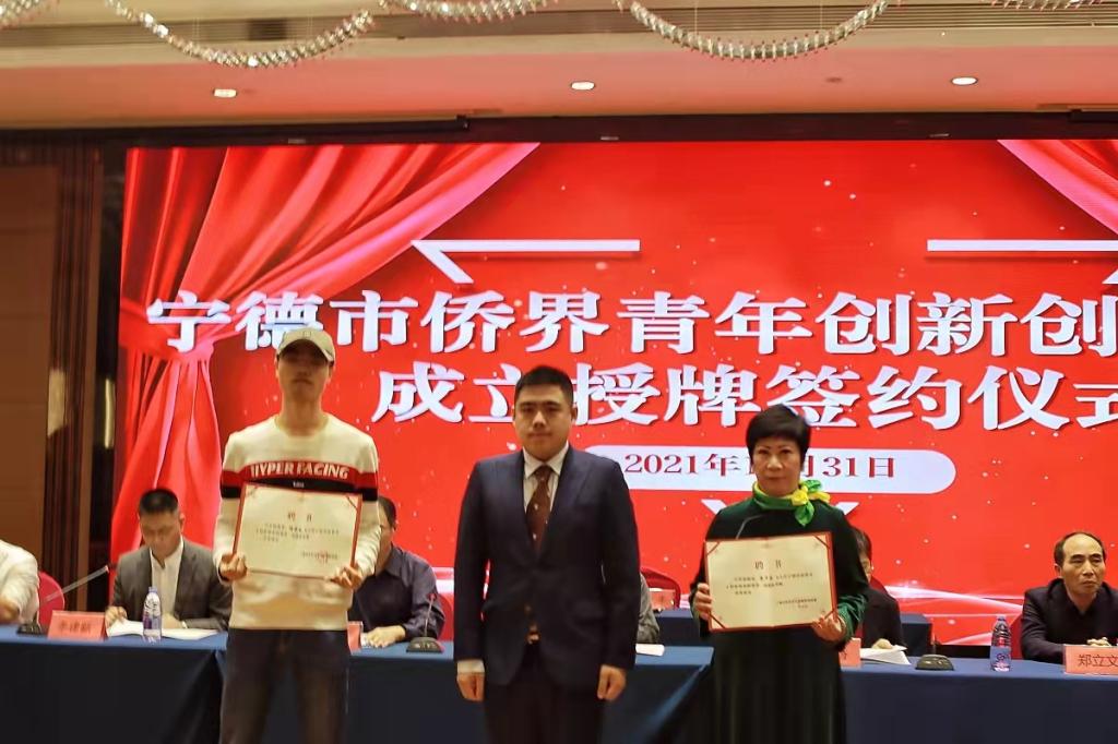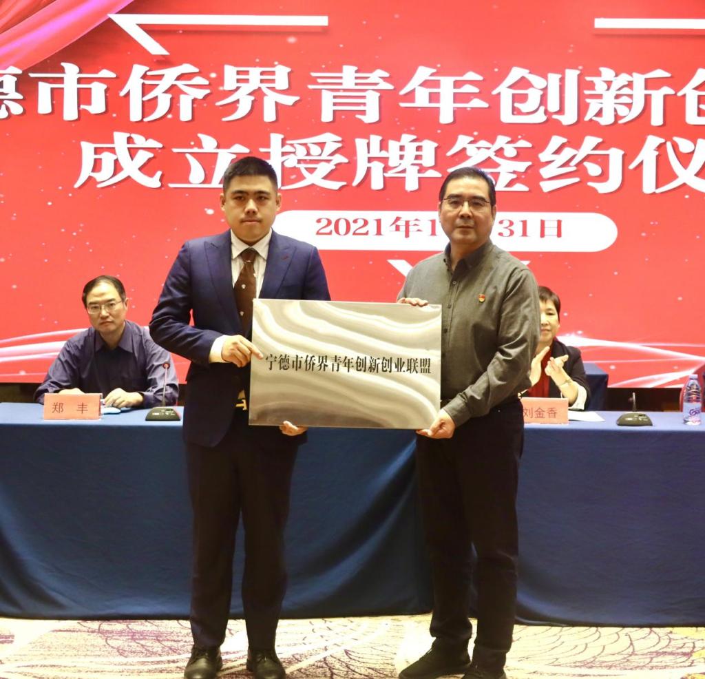 (图为宁德市侨联主席陈卫良为宁德市侨界青年创新创业联盟授牌)
