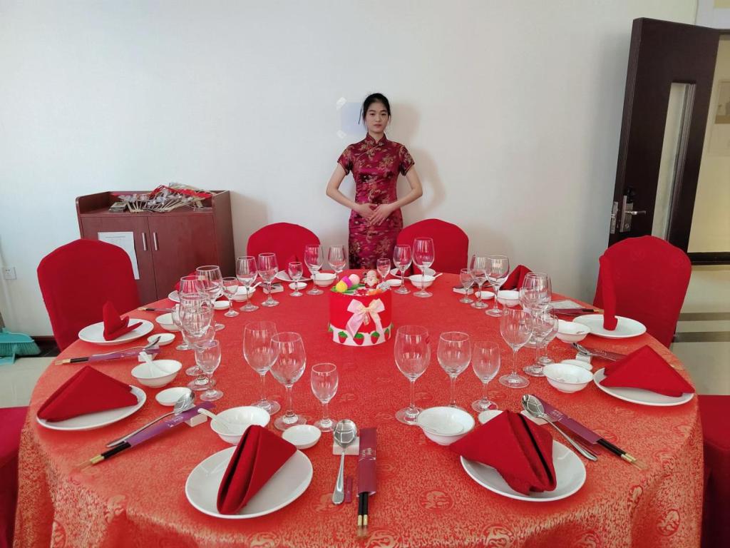 接着中餐宴会摆台的比赛也开始了,选手们保持着优雅的仪态,进行拉椅,餐碟、味碟、汤碗等物品的摆放。在摆放餐具时,骨碟定位要准,距离桌缘1.5cm。碗、味碟、筷架要位于骨碟上方呈一条直线。餐巾折花美观、挺括、平整,装饰物点缀于桌子中央。在摆放各类杯子过程中,选手们稳稳的端住盘子,不使杯子掉落。重要的是,所有餐具都要摆放整齐,不偏离客人位置的中心线,以示尊重。
