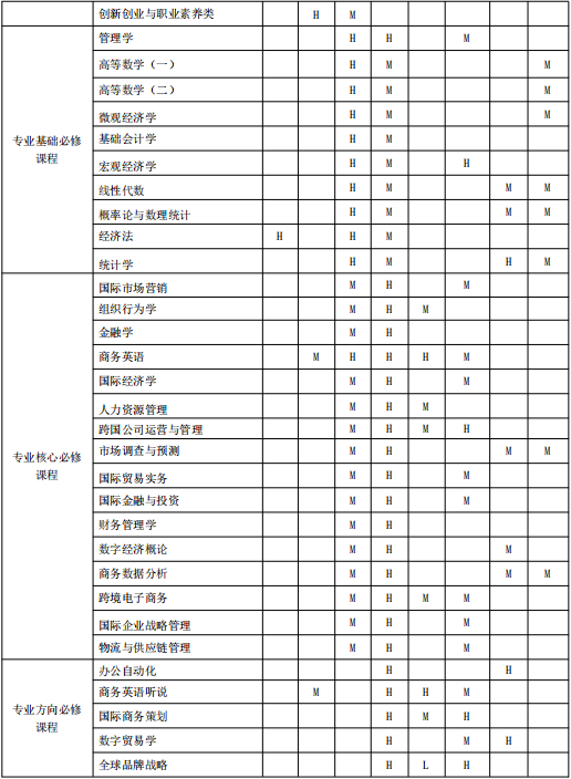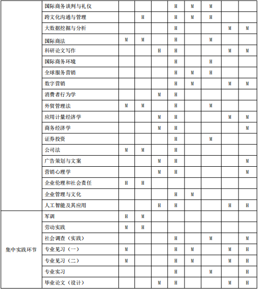 毕业要求4:专业能力。拥有国际商务领域的专业知识与操作技能,能够开展市场调查与预测、国际贸易实务、人力资源管理、国际金融与投资、财务管理、物流与供应链管理、跨境电子商务、跨国公司运营与管理等实际业务操作。