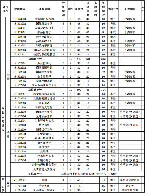 国际商务(闽台“4+0”)专业秉持“以学生为核心,注重实际能力和素质培养”的教育理念,旨在培养具有良好商业道德和创新精神,具备扎实经济学与管理学理论基础,熟悉国际商务规则及运行机制,掌握国际经济与商务领域专业知识与操作技能,具备较高的数字素养,精通至少一门外语,拥有国际视野和团队合作精神,能够运用跨学科知识解决复杂国际商务问题,适应数字经济时代需求的应用型、创新型复合人才。