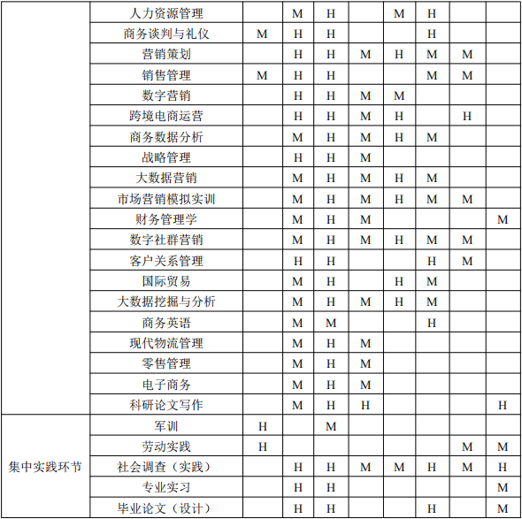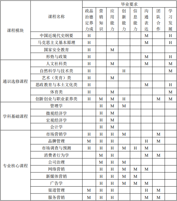 (以关联度标识,课程与某个毕业要求的关联度可根据该课程对相应毕业要求的支撑强度来定性估计,H 表示关联度高;M 表示关联度中;L 表示关联度低)