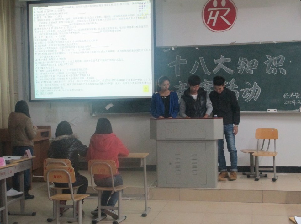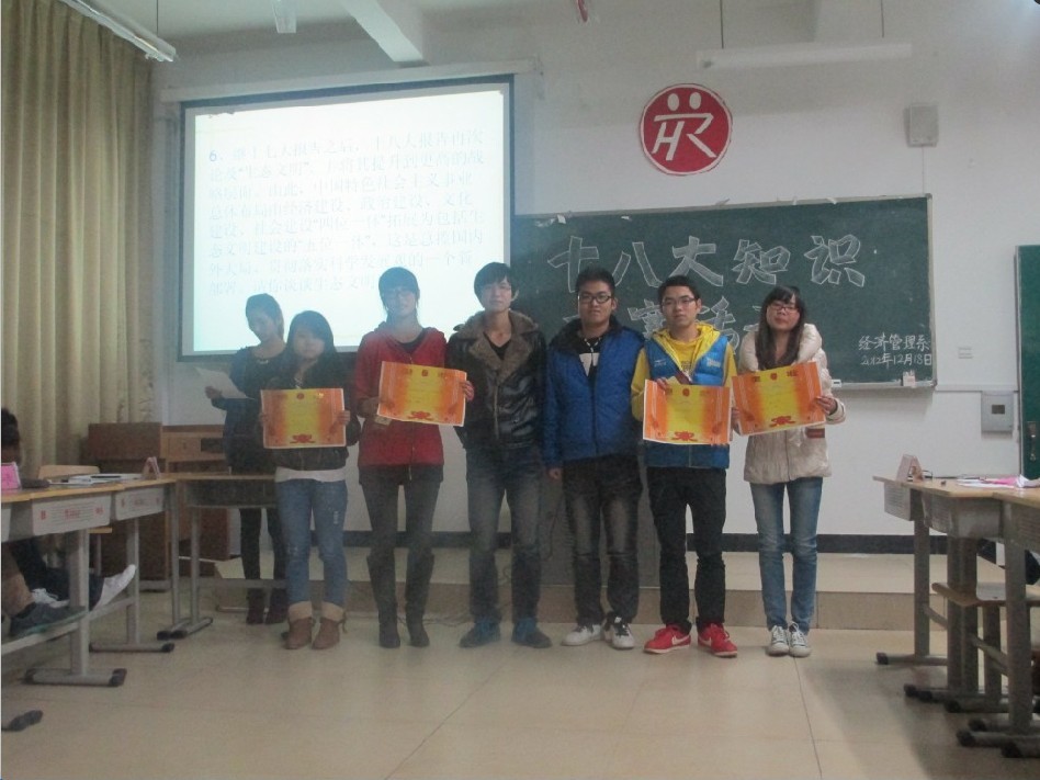 党的十八大是在我国进入全面建成小康社会决定性阶段召开的一次十分重要的大会,为了全系师生更好地学习贯彻党的十八大基本精神,引导大家理解党的十八大精髓与实质进一步统一思想、深化认识。我系于2012年12月18日晚7点在求真楼B栋302教室,开展了围绕党的十八大精神为主的知识竞赛问答活动。