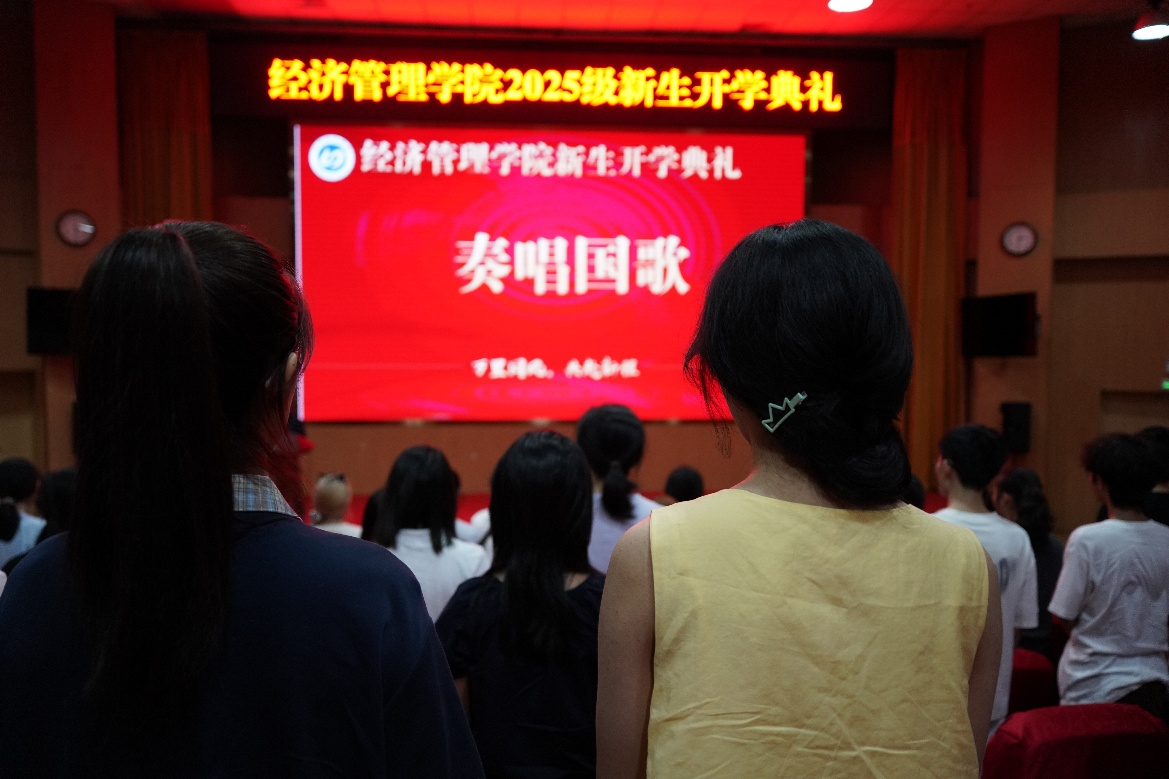 在庄严的国歌声中,典礼正式开始。院长周俪发表欢迎辞,向来自五湖四海的新生表示热烈欢迎,并寄语大家要在青春的赛道上奋力奔跑,用智慧与汗水书写属于自己的精彩篇章。老生代表陈依琳分享成长心得,鼓励新生保持热爱、勇敢追梦;新生代表李倩表达了对大学生活的期待,并承诺以奋斗姿态迎接每一个挑战。