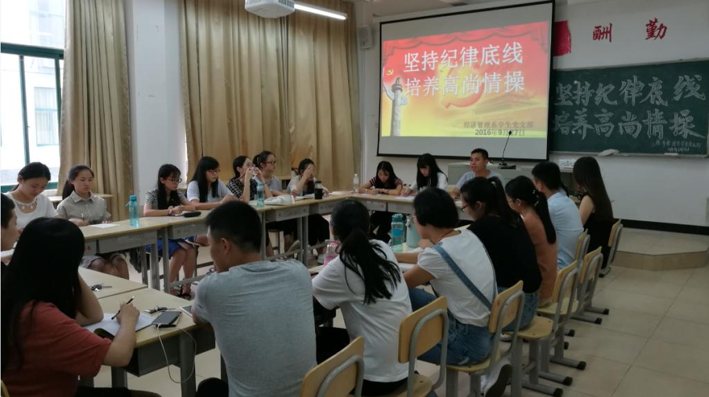 9月27日上午,经济管理系于求真楼b-204开展了主题为“坚守纪律底线,培养高尚情操”的党员学习会,本次学习会由系学生支部书记邱文君老师主讲,参加学习的有我系学生党员和入党积极分子。