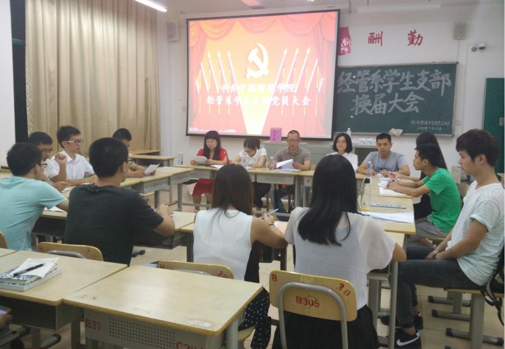 2016年9月23日晚上,经济管理系在求真楼-b204召开了经管系学生支部换届大会。参加本次大会的有系党总支副书记周建辉、系党务秘书周俪、系团委书记王佳佳、辅导员杜艳芳和邱文君以及我系所有在校党员。