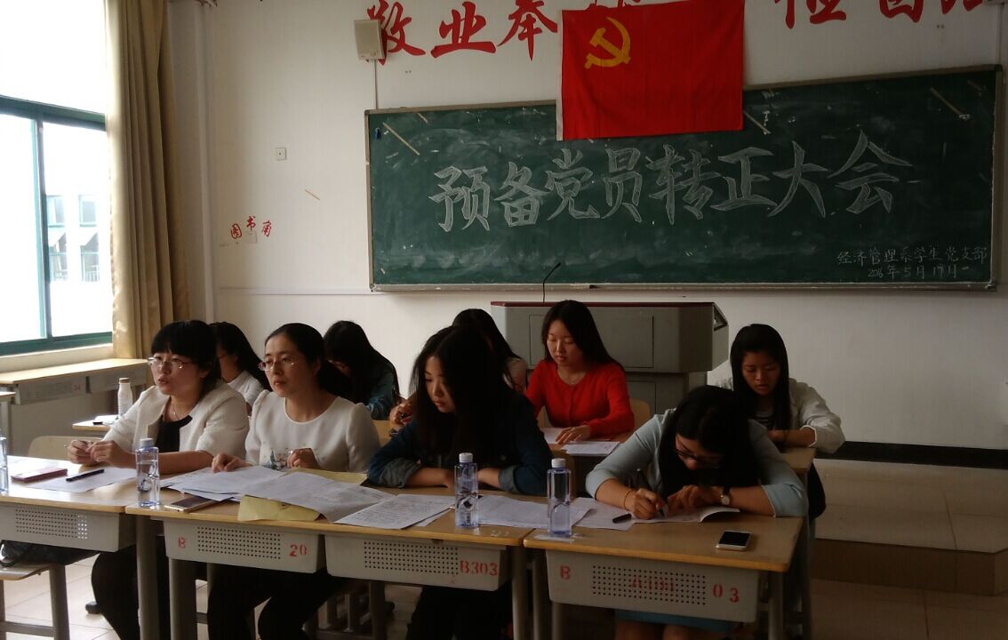 2016年5月17日下午,我系学生支部在求真楼Bb304召开了预备党员转正大会。经济管理系党务秘书兼学生党支部书记周俪老师、系团委书记王佳佳老师、袁曦和孙锴老师、3位学生正式党员和13位预备党员参加了本次会议。