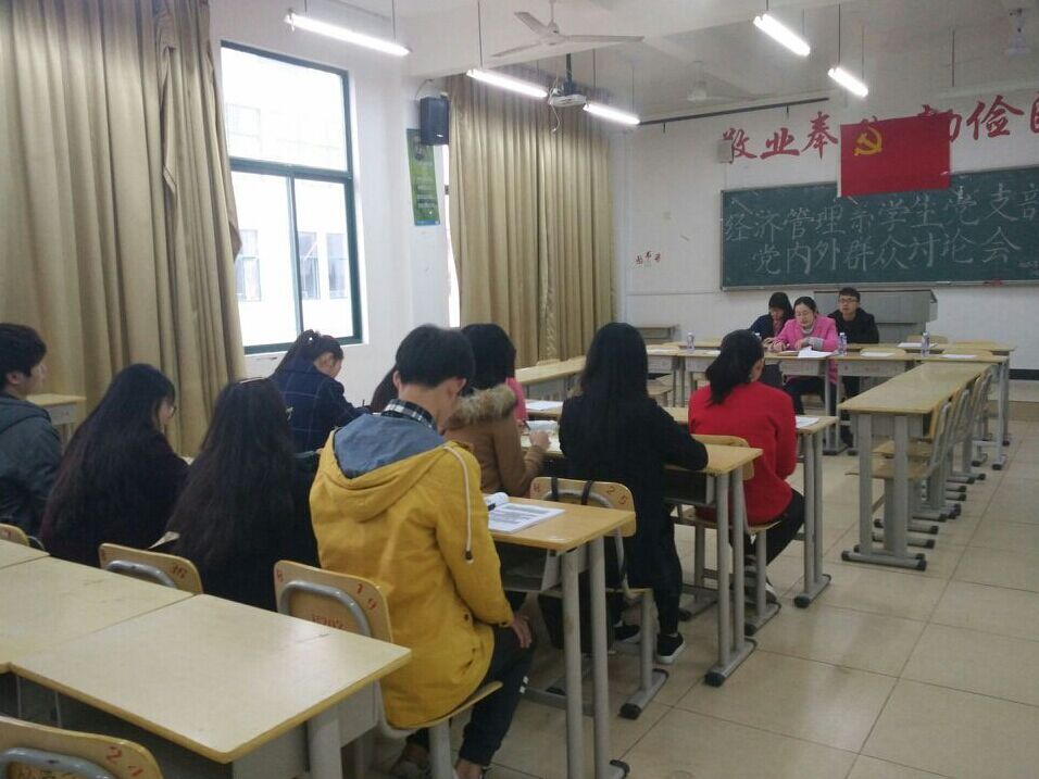 2016年3月29日下午4点,经济管理系于求真楼Bb304教室召开了经济管理系学生党支部党内外群众讨论大会和预备党员思想汇报会。出席两场大会的有经济管理系党务秘书兼学生党支部书记周俪老师,1名学生正式党员,9名预备党员以及4名党外群众。