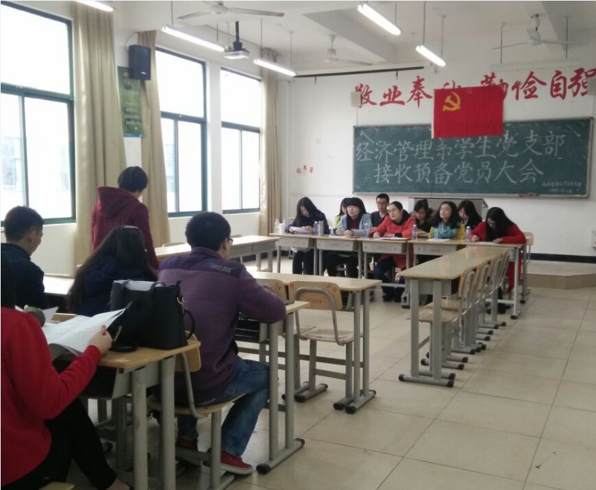 2016年3月22日下午16:00,经济管理系学生支部于求真楼Bb304召开接收预备党员大会。本次会议的议题是经管系学生支部接收李纬雁1名入党积极分子为预备党员。出席此次会议的有经济管理系党务秘书兼学生党支部书记周俪、系团委书记王佳佳、专职辅导员杜艳芳等党员老师。会议由周俪老师主持,王君瑶同学负责记录