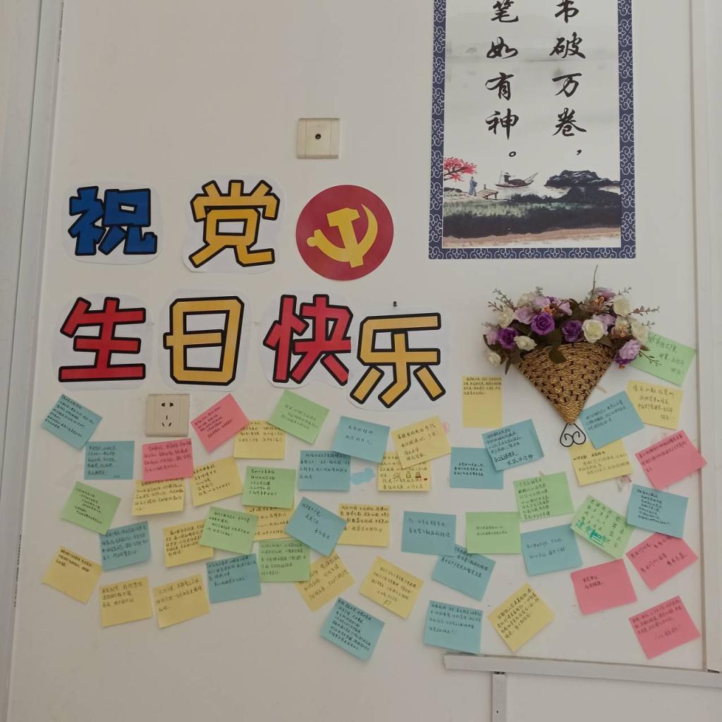 通过各班的共同努力,一面面风采各异的祝福墙脱颖而出。在每一面装点各异的祝福墙上、在一句句诚挚的话语中,同学们充分表达了自己对祖国的热爱,抒发了对党的美好祝愿,从中可以感受到红色文化的传承与漫延。这些各具特色的作品不仅展现了青年学生的创新思维,积极向上的态度,也让人感到青年人所蕴含的积极向上的无限正能量。