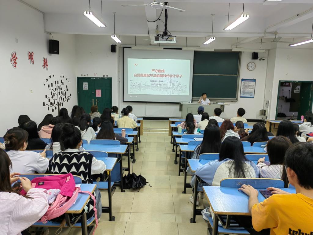 孙老师围绕《中国共产党纪律处分条例》简介、会计人员违法违纪典型案例、常见违法违纪典型案例解析三个方面进行了分享,勉励会计学子做到“诚信为本、操守为重、坚持准则、不做假账”,扣好廉洁从业的第一粒扣子。